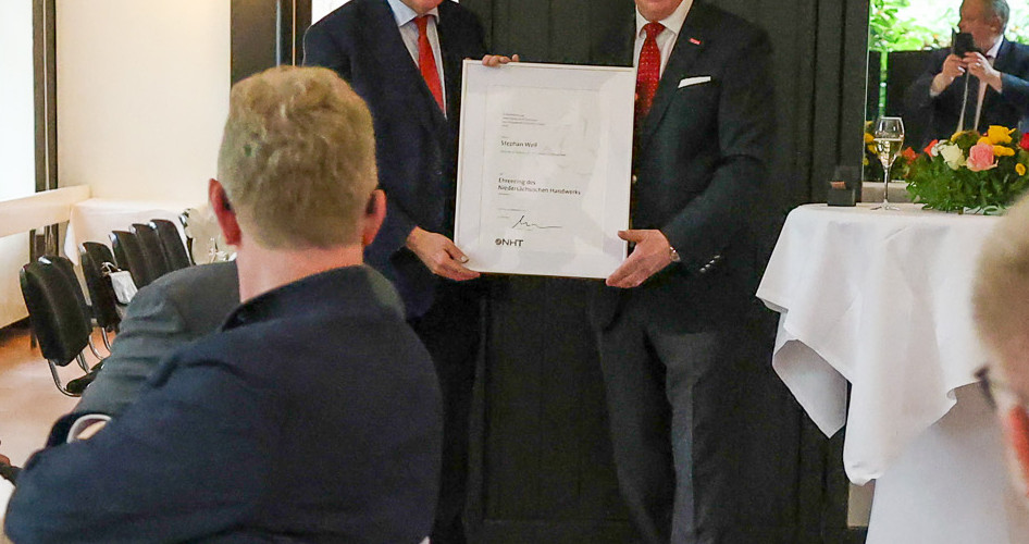 „Stephan Weil hat dem Handwerk nicht nur zugehört. Er hat hingehört – und zwar auch vor Ort in Werkstätten, auf Baustellen und in unseren Bildungszentren“, betonte NHT-Präsident Mike Schneider in seiner Laudatio. „Ministerpräsident Weil hatte immer ein offenes Ohr für die Anliegen des Handwerks als verlässlicher Arbeitgeber und bedeutender Ausbilder.“